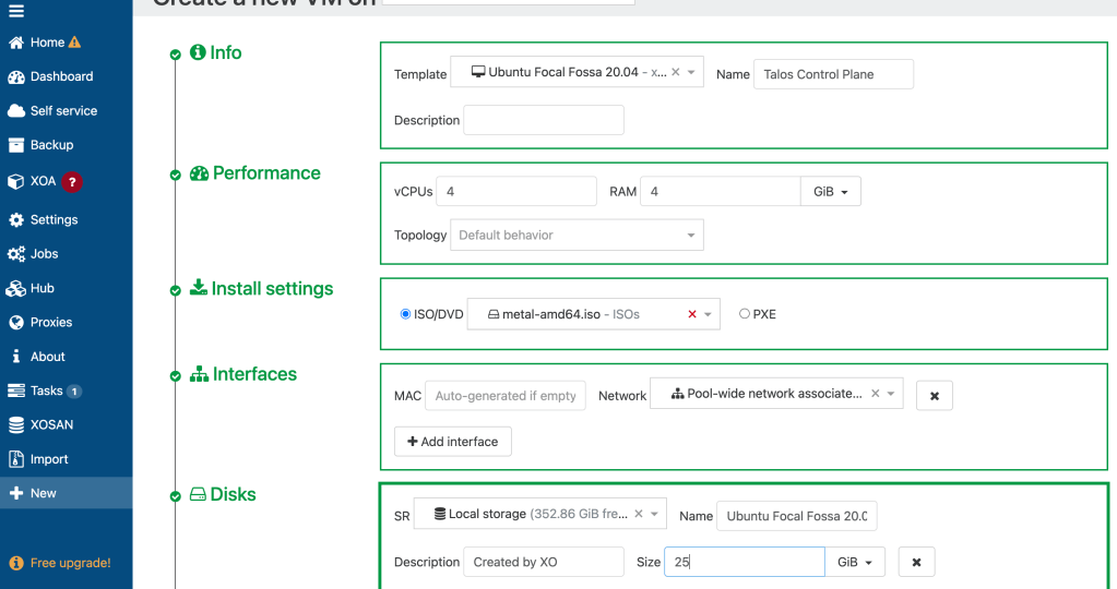 Step 1 is to download the ISO. I’m on AMD so I grabbed the metal-amd64.iso from the releases page. The next step is to upload the ISO to my Xen Orchestra ISO repository. For details on how to create an ISO repository if you don’t have one check out this article.